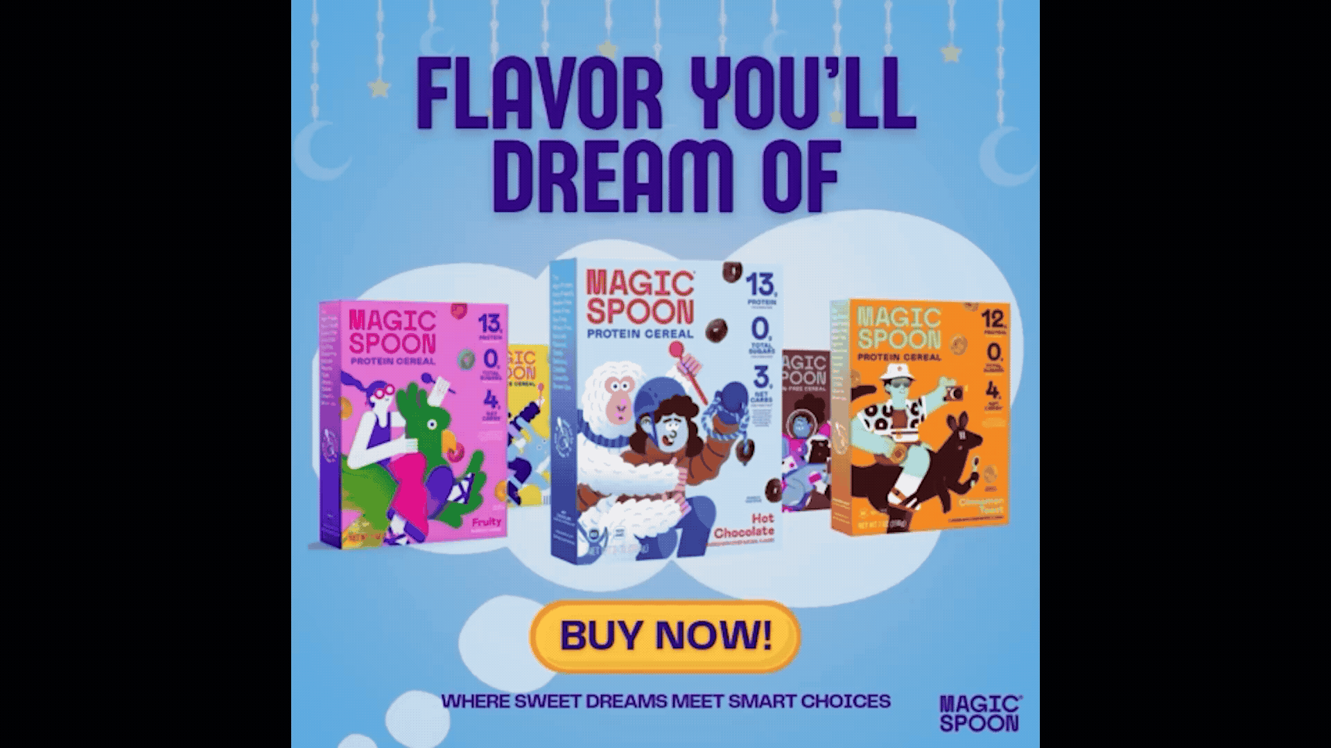 We decided to center the campaign around the idea of the dream-like designs on the packaging and the health benefits of the cereal. This led us to our slogan: "Where sweet dreams meet smart choices."
